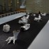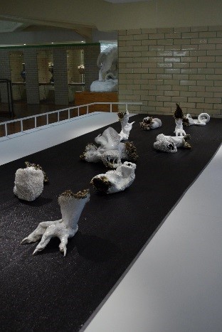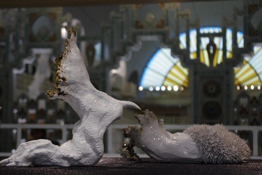 Cette installation « … n’aura pas lieu », présentée il y a peu à la galerie Le Fil Rouge – c/o la Q.S.P.) dans l’exposition Dans la région nocturne de mon oubli, est constituée d’un ensemble de douze éléments en faïence émaillée polychrome. Au même titre que la sculpture en céramique « Self Control », l’œuvre est le reflet du monde étrange et onirique de JP Racca-Vammerisse et de son appétit pour l’extraordinaire. Ainsi, l’artiste fait appel à l’imaginaire pour essayer de comprendre le réel souvent très sombre et violent. L’installation, réalisée suite aux tragiques événements qui ont eu lieu au Bataclan en 2015, présente une bête mythologique annonciatrice de la fin des temps, devenue une menace terrassée. Cette scène brutale ne laisse pas indifférent et ces morceaux de monstre mythologique venu d’un autre temps renvoient fatalement à des scènes tragiques pourtant bien réelles.