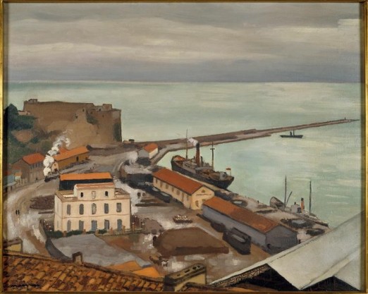 Albert Marquet est très tôt attiré par l’activité portuaire, la mer et les fleuves qui l’inspireront toute sa vie. Outre les côtes françaises, l’artiste aborde, dès l’automne 1908, les rivages de l’Afrique du Nord. Son premier voyage en Algérie date de 1920 ; dès lors, pendant vingt-six ans, presque chaque hiver, il gagnera son refuge algérois. En janvier 1925, le peintre et son épouse s’installent pendant deux mois à l’hôtel d’Orient de Bougie (aujourd’hui Béjaïa) commune littorale de Kabylie. Le point de vue retenu dans cette toile correspond vraisemblablement au champ de vision du peintre depuis la fenêtre de sa chambre d’hôtel. Surplombant son sujet, il saisit ainsi dans une vue panoramique le côté du port, occupé par la chambre de commerce et fermé par le fort Abd-el-Kader et par la longue jetée. Le port de Bougie suscita chez le peintre une production importante de variantes.