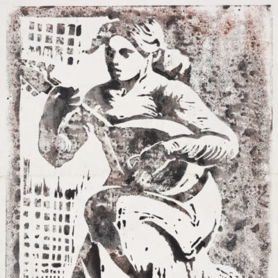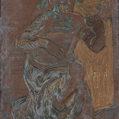 Odette LEPELTIER, Plaque de linoléum gravé du croquis de la femme jouant de la mandoline Odette LEPELTIER, Plaque de linoléum gravé du croquis de la femme jouant de la mandoline