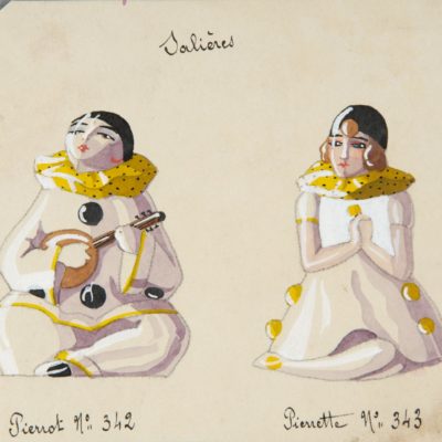 Salière « Pierrot et Pierrette », Etude de motifs pour la manufacture de Desvres, 1920-1930, Gouache et encre Salière « Pierrot et Pierrette », Etude de motifs pour la manufacture de Desvres, 1920-1930, Gouache et encre