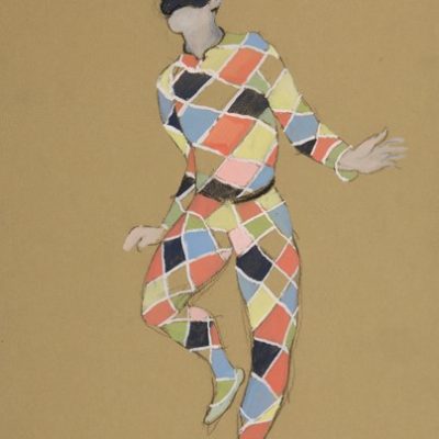 Gérard COCHET, Etude pour le costume du personnage d’Arlequin, vers 1943, Gouache sur traits au fusain Gérard COCHET, Etude pour le costume du personnage d’Arlequin, vers 1943, Gouache sur traits au fusain