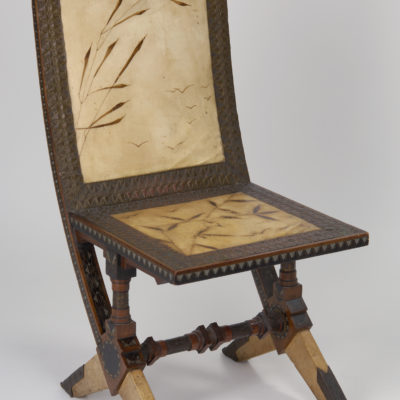 Carlo BUGATTI, Chaise basse, vers 1900, Bois, marqueterie d’étain et de laiton, cuivre repoussé, peau de chamois peinte Carlo BUGATTI, Chaise basse, vers 1900, Bois, marqueterie d’étain et de laiton, cuivre repoussé, peau de chamois peinte