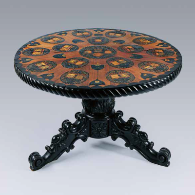 Charles DUBUQUOI, Guéridon tripode présentant des blasons, armoiries, noms de familles et noms de quartiers liés à la ville de Roubaix, 1860, Bois sculpté, marqueterie, verre Charles DUBUQUOI, Guéridon tripode présentant des blasons, armoiries, noms de familles et noms de quartiers liés à la ville de Roubaix, 1860, Bois sculpté, marqueterie, verre