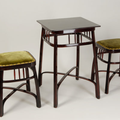 Marcel KAMMERER, Tabourets et table, vers 1900, Hêtre massif teinté acajou Marcel KAMMERER, Tabourets et table, vers 1900, Hêtre massif teinté acajou