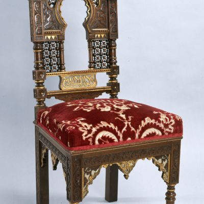 Chaise de style oriental, 2e moitié XIXe siècle, Bois naturel, décor sculpté et peint, lettres dorées, tissage façonné en velours Chaise de style oriental, 2e moitié XIXe siècle, Bois naturel, décor sculpté et peint, lettres dorées, tissage façonné en velours