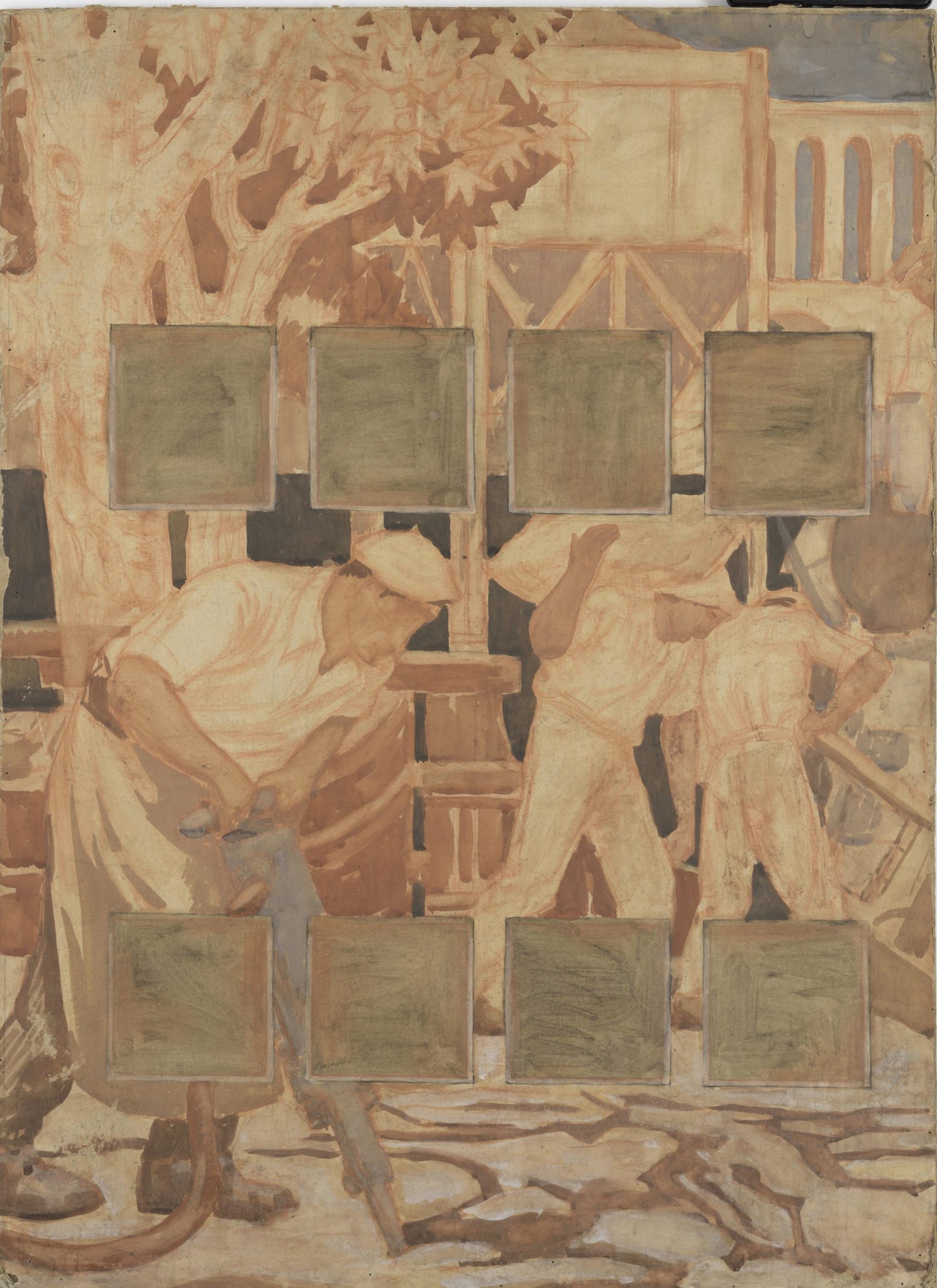 Lucien MARTIAL, Étude préparatoire pour une fresque destinée à la Maison du Travail, Exposition de 1937, Gouache sur calque contrecollé sur isorel Lucien MARTIAL, Étude préparatoire pour une fresque destinée à la Maison du Travail, Exposition de 1937, Gouache sur calque contrecollé sur isorel