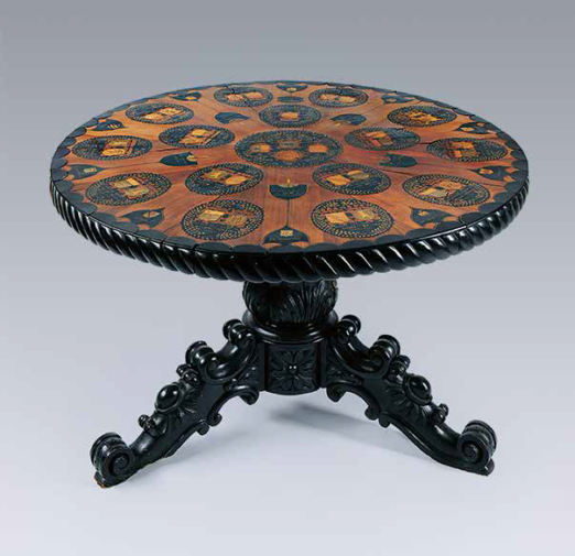 Charles DUBUQUOI, Guéridon tripode présentant des blasons, armoiries, noms de familles et noms de quartiers liés à la ville de Roubaix, 1860, Bois sculpté, marqueterie, verre