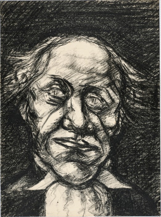 S’inscrivant dans la série de dessins qu’Armand Nakache consacra aux Mauvais Juges dans les années 1930, ce dessin entretient également une étonnante complicité avec les figures de clowns et scènes de cirque peintes par l’artiste tout au long de sa carrière. L’expérience de la Grande Guerre, au cours de laquelle Nakache fut blessé, a ébranlé irrémédiablement sa foi en l’homme, le rendant témoin d’une tragi-comédie qu’il n’aura de cesse par la suite d’aborder. Faisant siens les mots de Verhaeren (« Nous sommes tous des Christs qui embrassons nos croix »), l’artiste dépeint une humanité sans fard, avec une violence et une puissance tragique servies par un graphisme énergique et truculent. Ce dessin évoque ainsi tout à la fois les Célébrités du Juste Milieu croquées par Daumier, les effigies clownesques ou christiques de Rouault, l’âpreté des images sacrées de Desvallières, ou encore les œuvres de Soutine ou Ensor. Membre fondateur du Salon populiste, de la société de gravure « Le Trait » et du Salon des « Peintres témoins de leur temps », Armand Nakache constitue une figure clef de la scène artistique de l’entre-deux-guerres et demeure le représentant absolu du courant de « l’expressionnisme fantastique ».