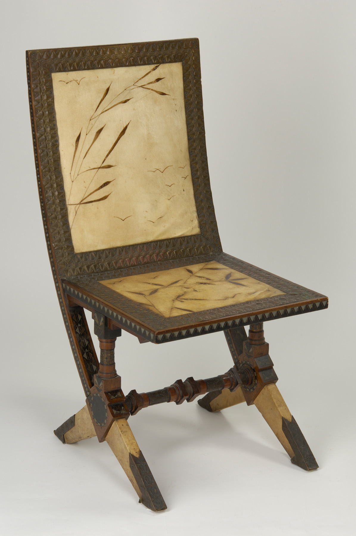 Bois, marqueterie d’étain et de laiton, cuivre repoussé, peau de chamois peinte