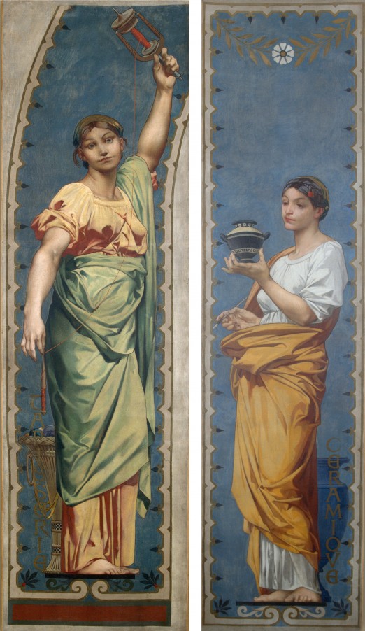 Formé aux Arts décoratifs puis à l’École des beaux-arts, où il suit l’enseignement de Pils, Luc-Olivier Merson obtient le grand prix de Rome en 1869 et connaît une carrière ponctuée de récompenses officielles et de commandes. Les deux figures allégoriques de La Tapisserie (identifiable à la bobine et au dévidoir qu’elle brandit) et de La Céramique (dotée d’un stylet et d’un vase de forme antique) sont des cartons pour des panneaux exécutés en mosaïque par les ateliers spécialisés de la Manufacture de Sèvres. Ces décors étaient destinés à orner le portique monumental éclectique érigé par Paul Sédille pour le pavillon des Manufactures nationales des Gobelins et de la Savonnerie lors de l’Exposition universelle de 1889 (ils y valurent à l’artiste une médaille d’or). La simplicité décorative découle de l’adaptation du peintre à l’urgence de la commande et aux contraintes de la technique : les teintes furent choisies dans la gamme d’émaux disponibles pour les tesselles. Immédiatement réutilisées entre 1889 et 1891 comme cartons pour des tapisseries tissées aux Gobelins (la matière très légère et finement brossée laisse apparaître dans les marges des annotations de travail relatives à cet usage), les compositions furent en outre remployées pour orner la façade de la Manufacture de Sèvres.