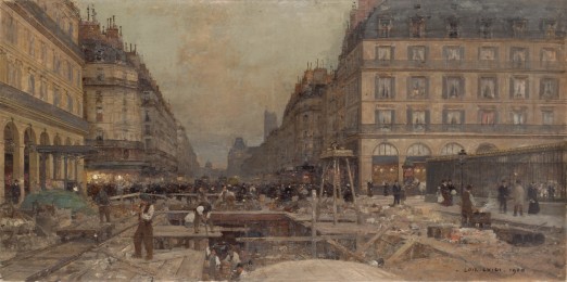 Dans un format très horizontal, Luigi Loir s’attache à représenter un événement mémorable qui anima le paysage urbain du Paris haussmannien, la construction du métro en 1900. La scène se situe rue de Rivoli, au niveau du palais du Louvre ; les ombres de l’hôtel de ville et de la tour Saint-Jacques marquent l’horizon. L’attention se concentre sur le chantier lui-même, le costume de travail des ouvriers et leurs outils. L’œuvre doit beaucoup au traitement de la lumière que les artistes de la génération de Luigi Loir ont emprunté aux impressionnistes. Mais ce paysage assez conventionnel est surtout un témoignage que l’artiste eût pu espérer vendre pour un décor public, par exemple une mairie parisienne. Né en Autriche de parents français, Loir reçut une formation de peintre décorateur et se consacra presque exclusivement à des vues de la capitale auxquelles il doit le meilleur de sa réputation. La toile de Roubaix s’inscrit parfaitement dans ces interprétations talentueuses des aspects très variés du Paris de la fin du XIXe siècle et du début du XXe, entre Belle Époque et société industrielle.