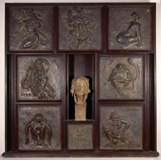 Ce retable, composé de reliefs de plomb et de bronze incrustés dans une grande structure de bois et encadrant un buste de plâtre, témoigne du goût de Pierre Roche, artiste au solide bagage scientifique, pour l’expérimentation et l’invention de procédés originaux et traduit son intérêt pour le bas-relief et les liens entre architecture et sculpture. Dès 1904, l’artiste dédie aux victimes de la guerre russo-japonaise quatre visions qu’il modèle l’année suivante sous les titres de L’Orgueil, L’Envie, La Colère et L’Avarice. Il leur adjoint les trois reliefs de La Gourmandise, de La Luxure et de La Paresse, ainsi que le buste d’une femme aux cheveux tressés, dont les mains coupées au poignet sont collées sur les oreilles, et présente cet ensemble des sept péchés capitaux en 1905 sous le titre de Délivrance. En 1910, il le confrontera à son pendant allégorique, les Sept OEuvres de la Miséricorde. Profession de foi idéaliste et antidéterministe, cette vision symboliste prône la prière et le repli sur soi pour échapper aux contingences du quotidien et aux mauvaises influences du monde extérieur.