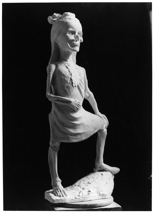 In a prominent position, the terrifying sculpture by René Iché is thought to have been sculpted on 27 April 1937, as soon as the artist heard news of the bombing on the radio. Interrupting the family meal, he asked his youngest daughter Hélène, aged 6 at the time, to pose for him and swiftly sculpted a skeletal, standing figure of a young girl. With a penetrating, pitiless stare and torn dress, she is shown in an arrogant posture, evoking the medieval Dance of Death as a backdrop to this contemporary nightmare.