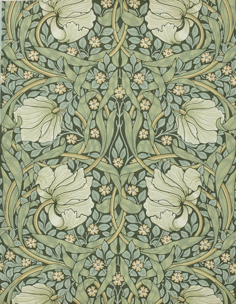 William MORRIS, Jeffrey &Cie, The Pimpernel, Vers 1876, Papier continu à pâte mécanique, fond vert brossé à la main, impression à la planche de bois …