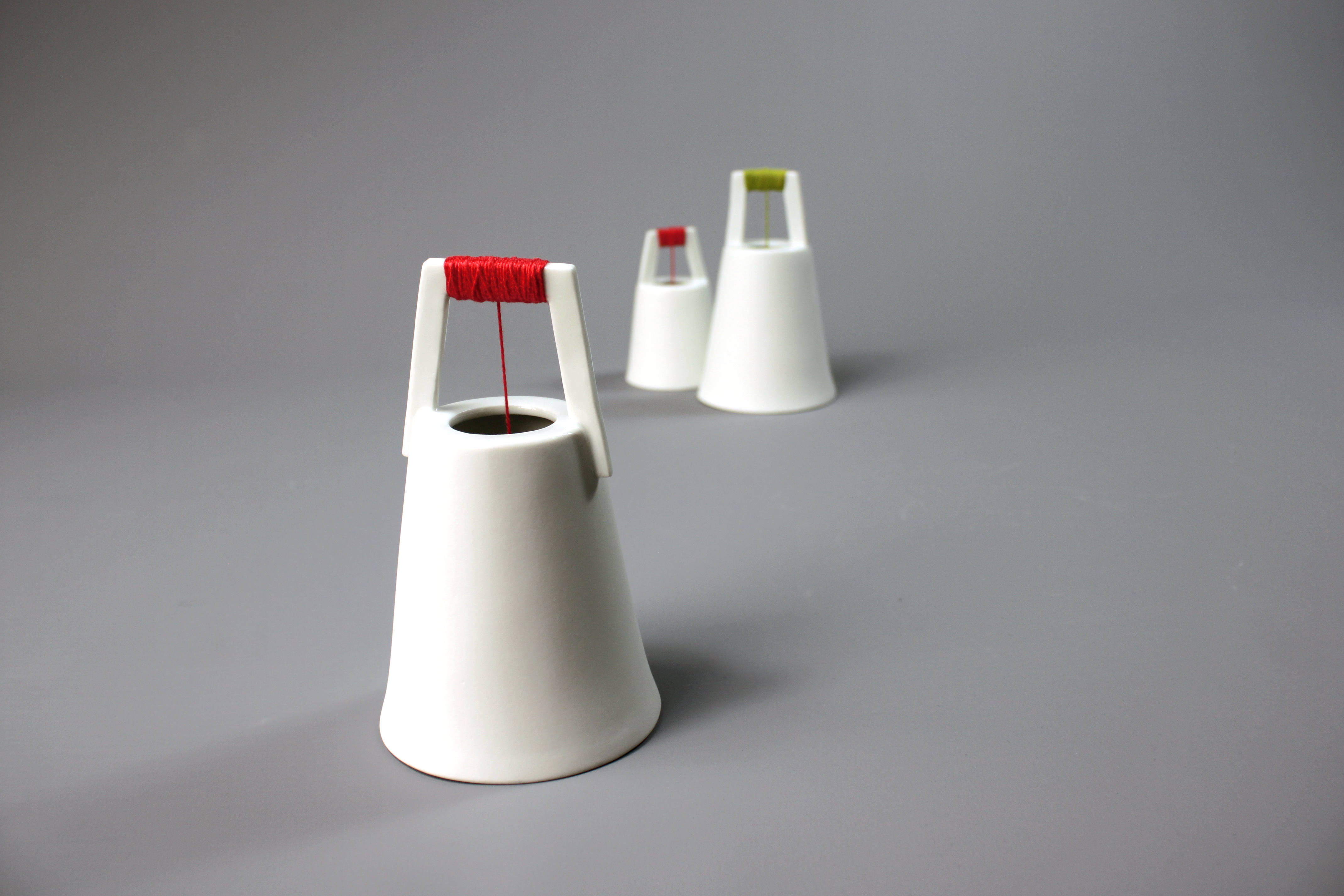 Marie SAMSON, … Petits puits sonores aux lignes pures et géométriques, design et poésie pour cloches à poser, Prix du jury 2015, coulage et travail à la plaque, porcelaine émaillée et cordon coton, cuisson four électrique. |← RING MY BELL !
