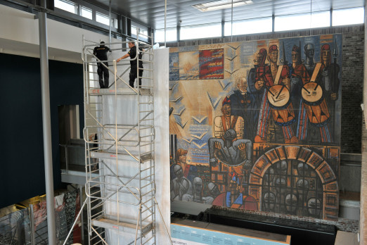 28.08.2017 Mise en place de la protection sur l »oeuvre de Marcel Gromaire, L’abolition de l’esclavage, dans le hall d’accueil | Oeil du chantier