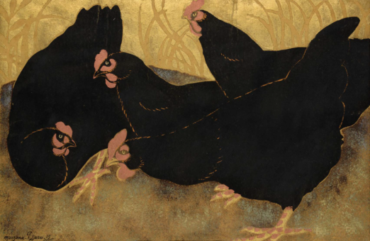 Georges Manzana-Pissarro, Les Quatres Poules, Encre et gouache au pochoir sur papier doré