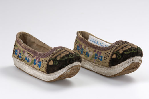 Paire de chaussures chinoises, Soie brodée, velours, fil, métal, or