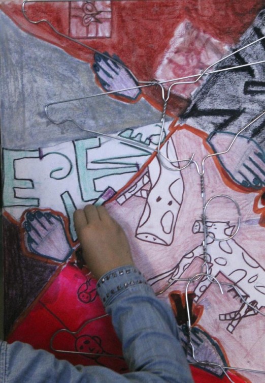 Les notions de chaîne, de trame, de croisement de fils amènent chaque enfant à la réalisation d’un tissage où des bandes de tissus rencontrent fils, cordons, végétaux et papiers.